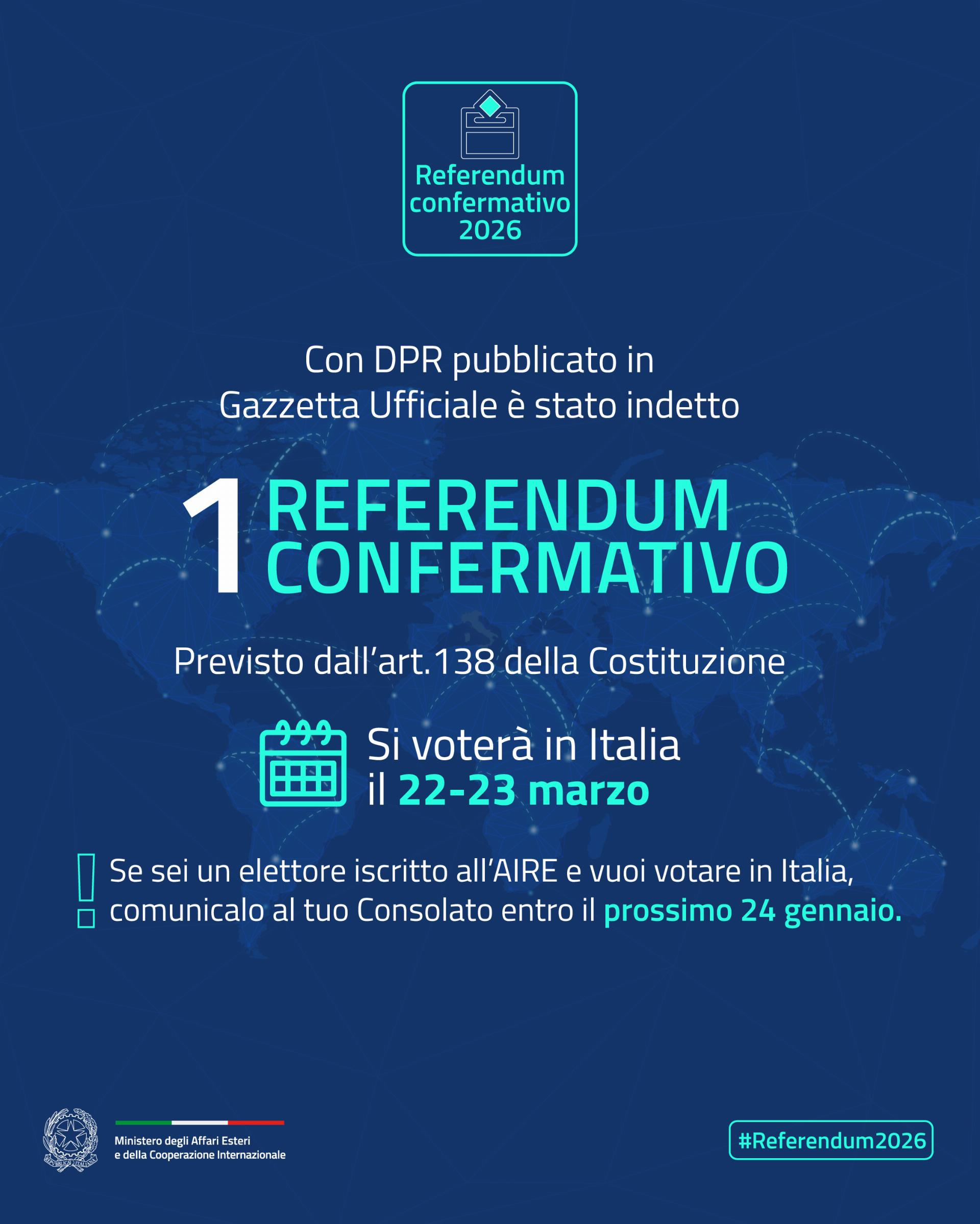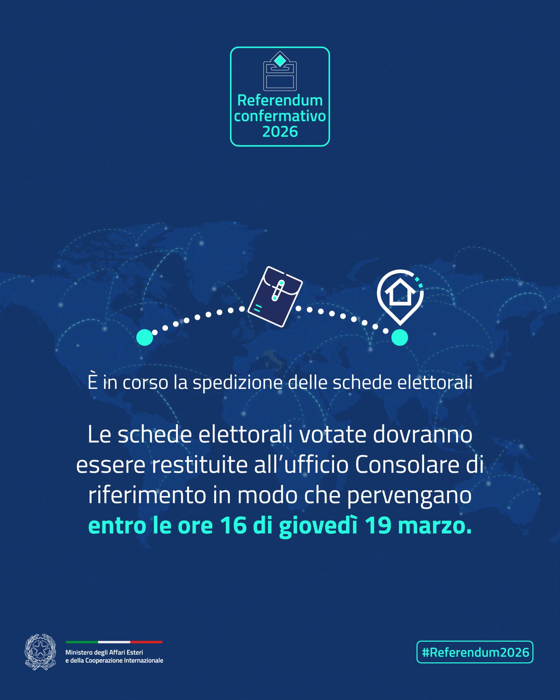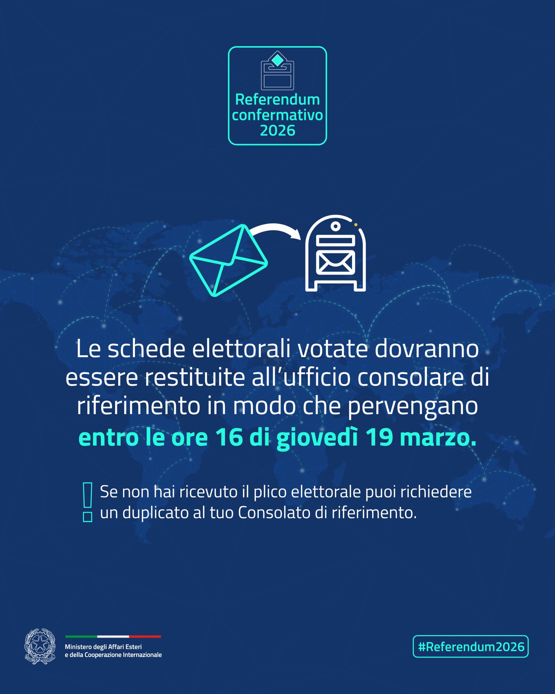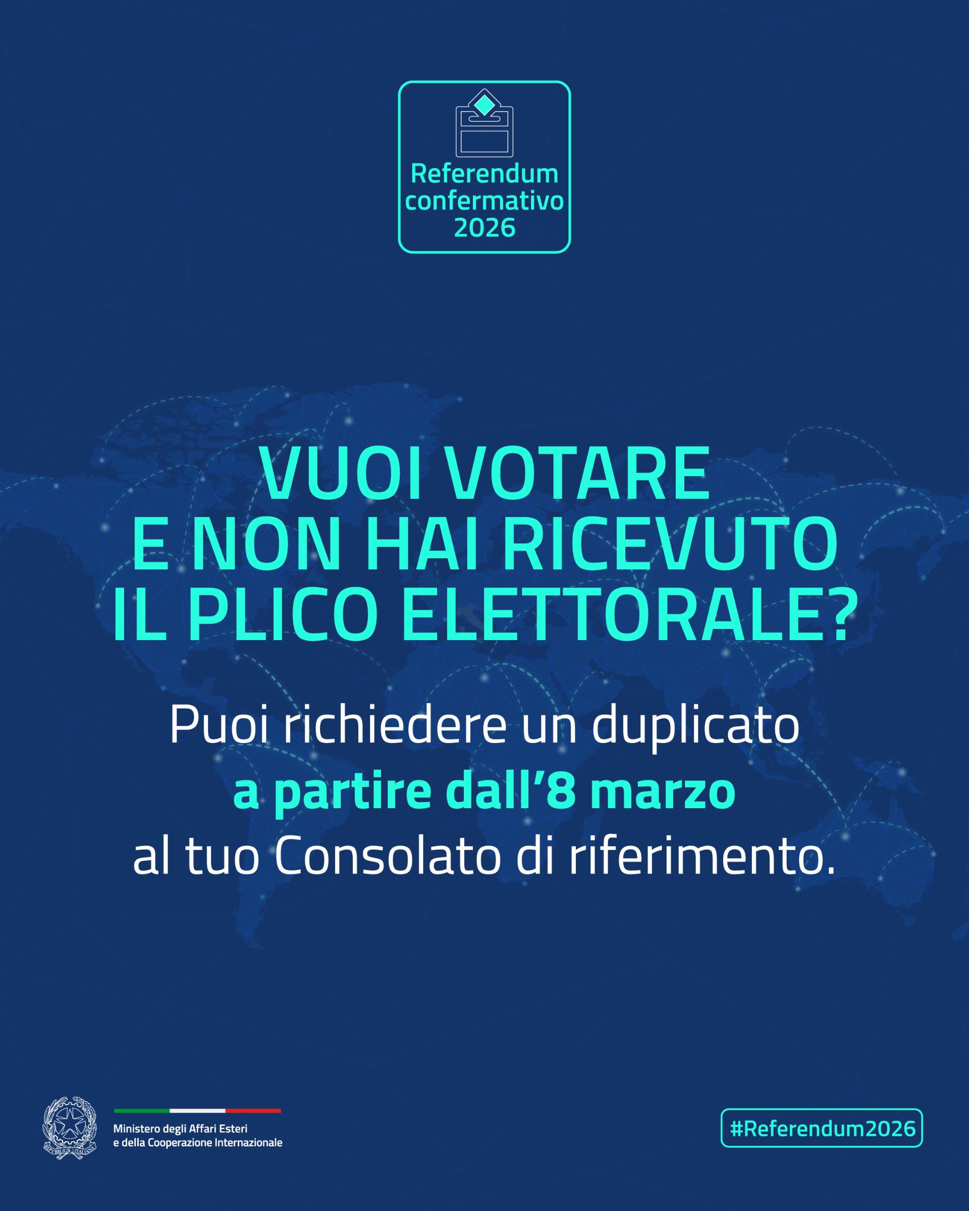 ATTENZIONE: gli elettori che ENTRO L’8 MARZO 2026 non abbiano ancora ricevuto il plico elettorale potranno contattare il proprio ufficio consolare per ottenere il DUPLICATO.